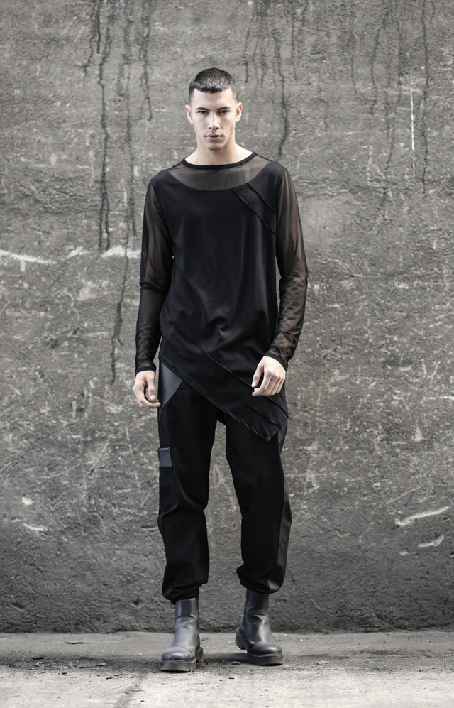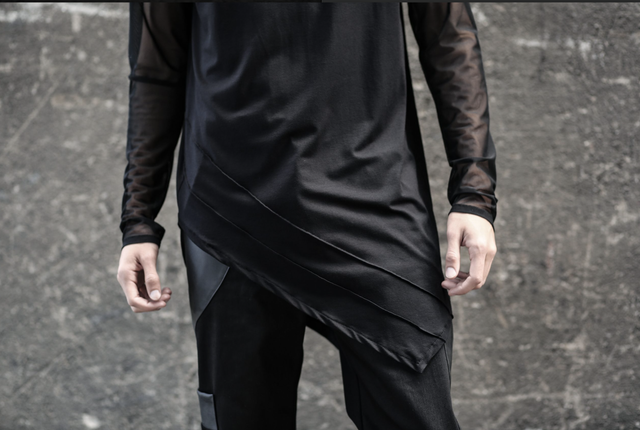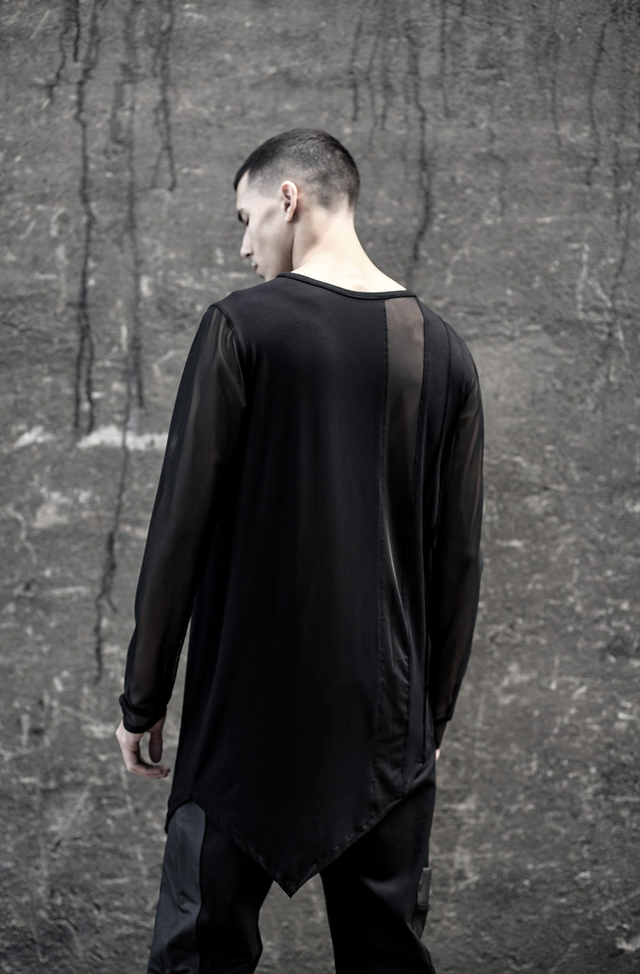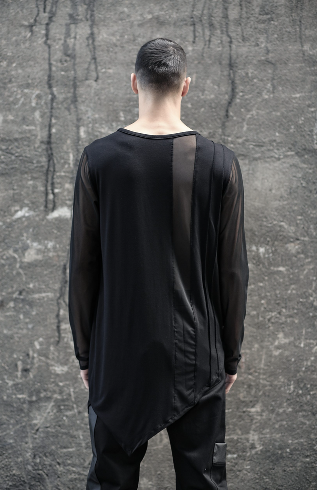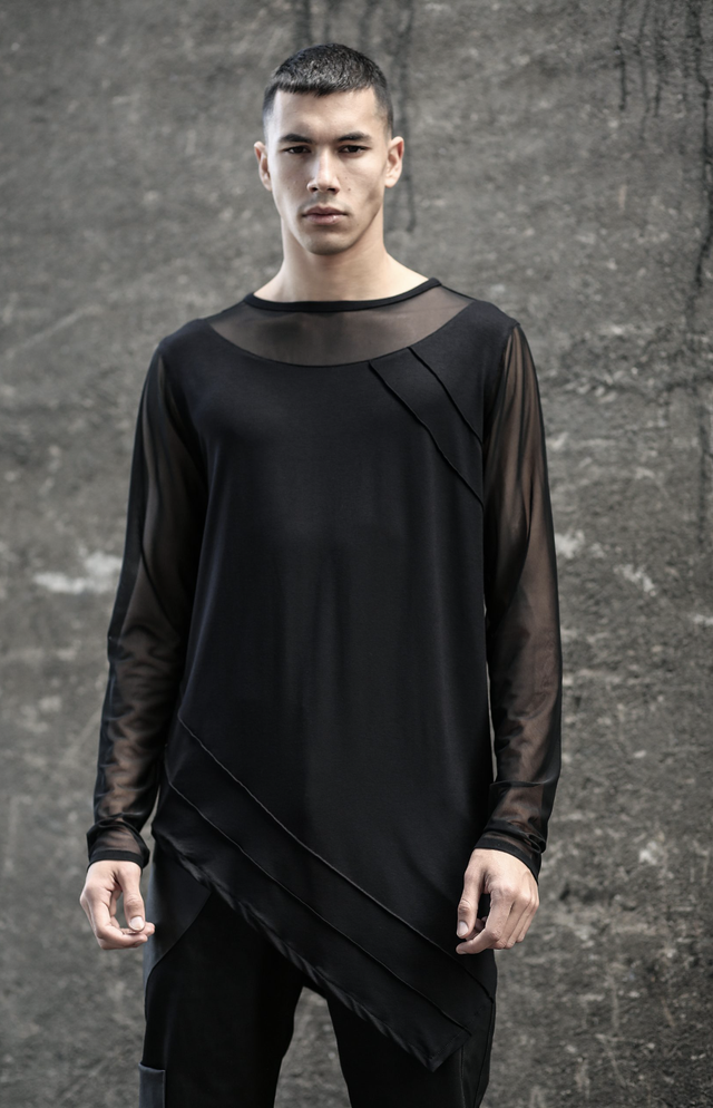 Asymmetric blouse made of viscose and mesh fabric. Light to wear.